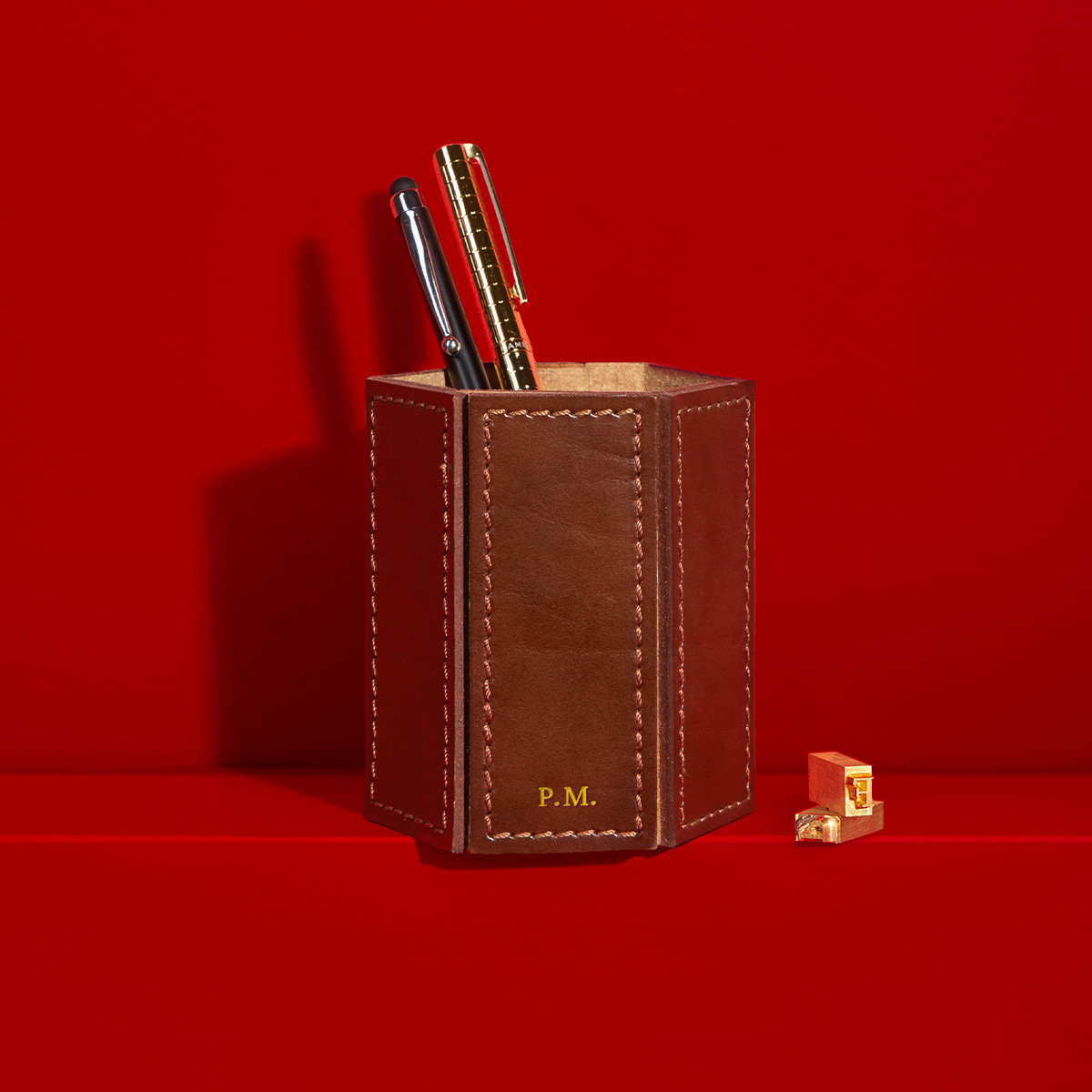 Contenitore portapenne e matite in rigenerato di cuoio di alta qualità, con forma esagonale che omaggia il Battistero di Firenze. Il design strizza l'occhio al passato infatti, utilizzando un materiale contemporaneo e innovativo come la pelle rigenerata, scelta per le sue caratteristiche idrorepellenti e antiscivolo. Progettato e realizzato per te all'interno del nostro laboratorio di famiglia a Firenze, si adatta perfettamente a qualsiasi tipo di ufficio.